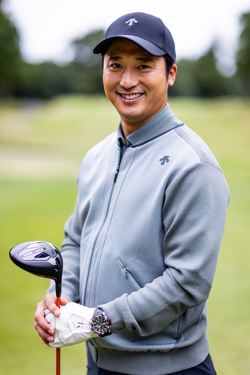 ▲ ジップブルゾン3万5200円、ポロシャツ2万2000円、パンツ2万5300円、キャップ1万 7600円/すべてデサントゴルフ(デサントジャパン お客様相談室)、時計63万8000円/エドックス(ジーエムインターナショナル)、その他は本人私物