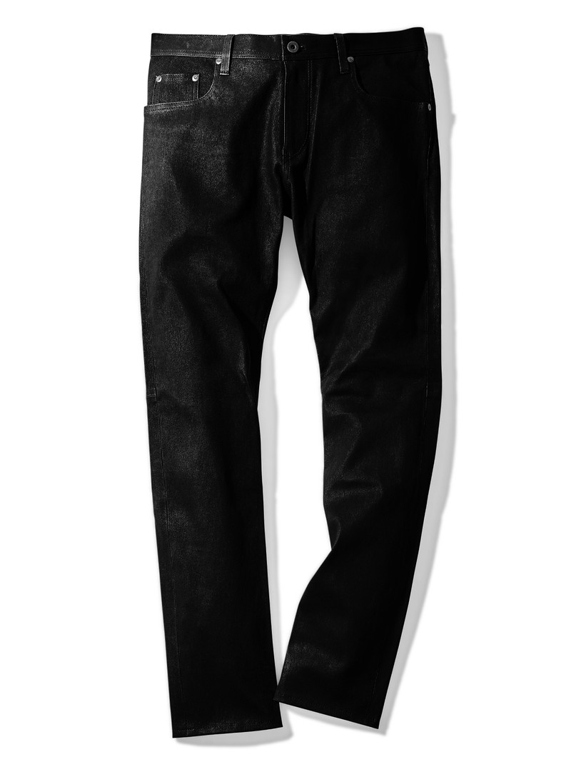 運賃のみならず、国を跨ぐごとに関税もかかるわけで、そりゃ高価になるよなぁ。その魔法のような伸縮性によるはき心地の良さはジャージー以上。でもルックスはロックミュージシャンが窮屈さをガマンしながらもビシッとはきこなすクールでスーパースキニーなシルエット。ディアスキンならではのマットなブラックカラーも良い。革パンなるもの、着用を重ねるとどうしても膝の部分に伸びが生じてしまい、ダラしないシルエットになってしまうのだが、予めストレッチ機能を備えたこのパンツはその心配も無用。