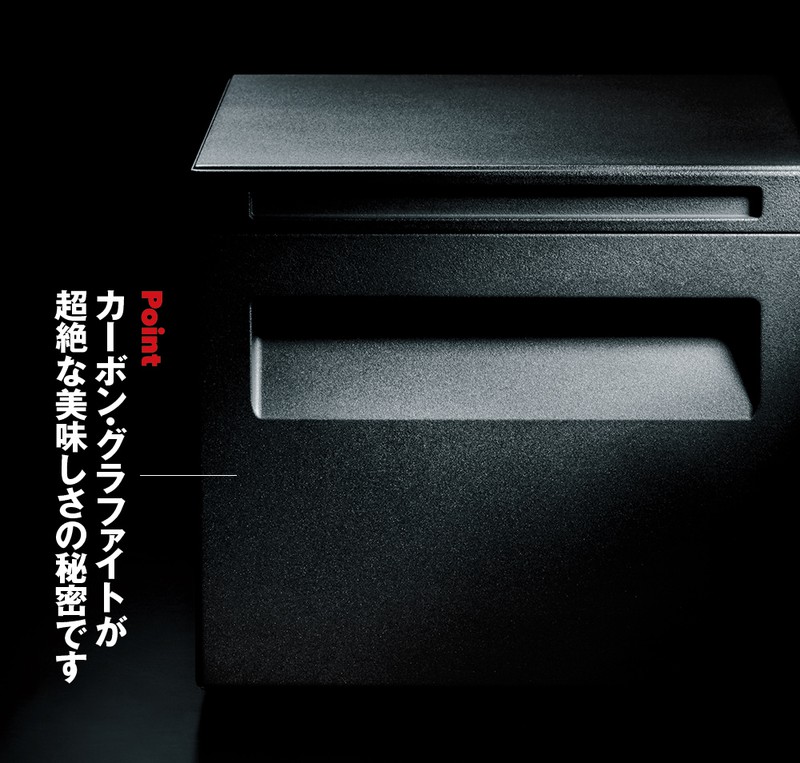 それだけでも“ヒザポン”ものですが、何といってもハイライトは、削り出しのカーボン・グラファイト製、という点。鋳物鉄の5倍を誇る遠赤外線が料理を美味しくするのはもちろん、導電性にも優れているため、直火、IH、オーブンにも対応。