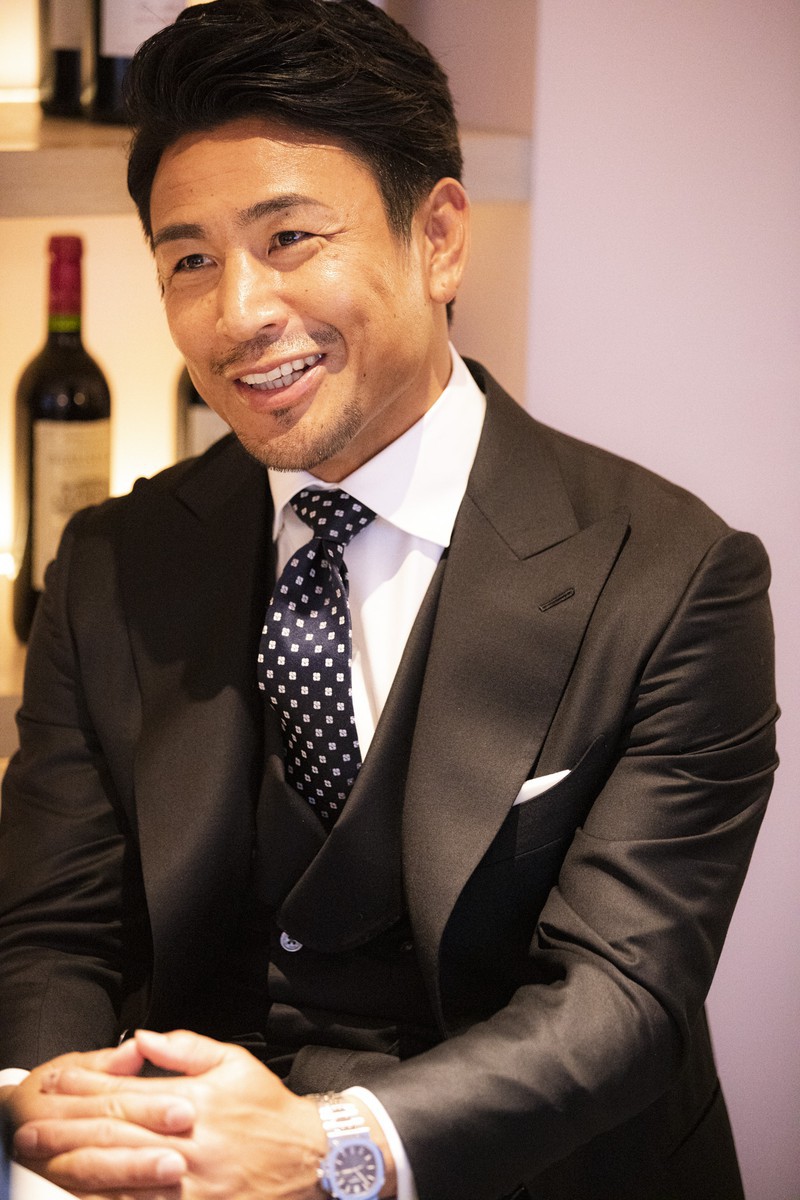 魔裟斗 今日着ているのは信頼している「東京テーラー」で作ったスーツなんですが、体のラインがきれいに出るのに、着ていても疲れない。今回のオーダーで5、6着目なんですが、本当にドンピシャの形なんですね。僕は昔から服をたくさん買いますし、スーツも好きでよく作るんですけど、今日のスーツはこれまでで一番と言えるくらいフィットしています。