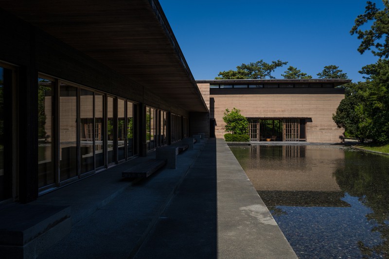 全ての部屋から富士山の伏流水をたたえた水盤が望め、松が風に揺れる音に癒される。