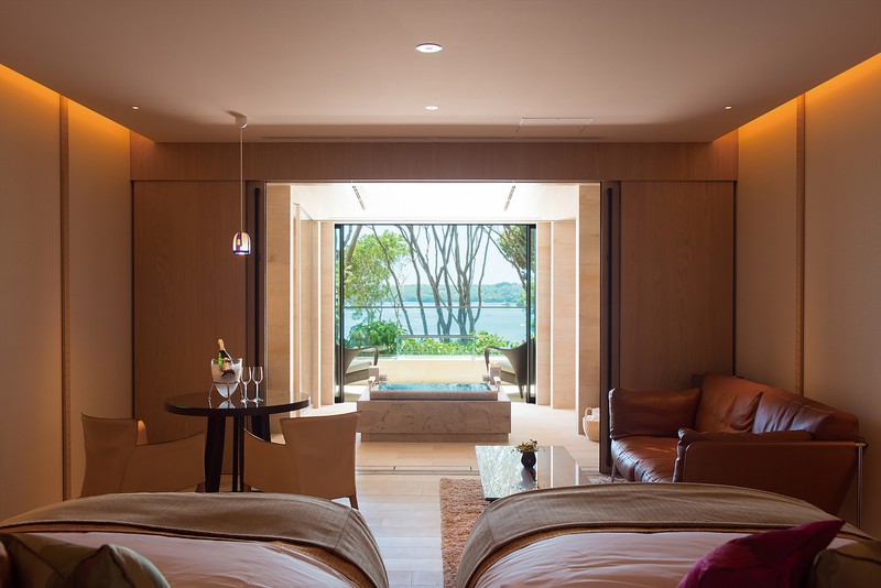 英虞(あご)湾を見下ろす高台に、本棟4室+別棟4室の計8室。本棟は木を多用した温かみのある印象、一方の別棟は英虞湾に向かってベッドルームからバスルームへ一直線に続く大胆なデザイン。魅力はそれぞれ違いますが、客室で温泉を楽しむなら、別棟がおすすめ。英虞湾に面した窓を全開すると、バスタブがセミ露天風呂となり、開放感もバツグン。しかもこのバスタブ、インフィニティエッジです。