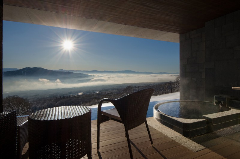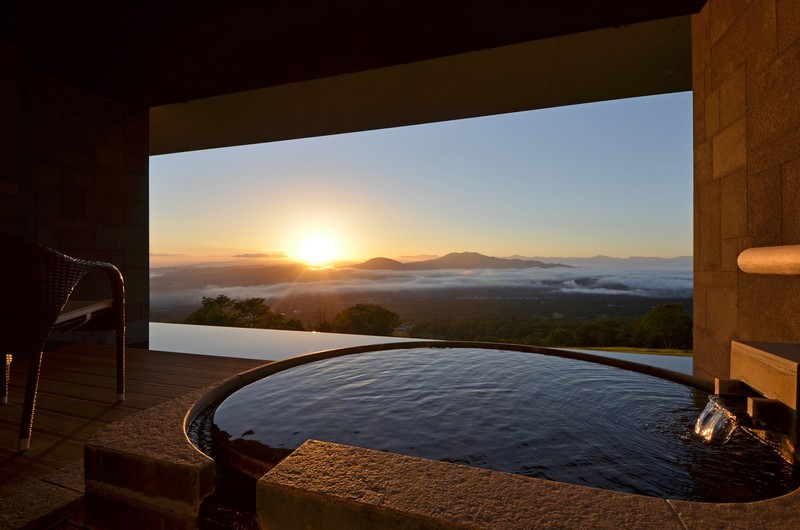 ▲ SPA&SUITE棟の客室の露天風呂から。運が良ければ、雲海を照らすご来光のシーンも。カラダのみならず、心まで洗われるよう。