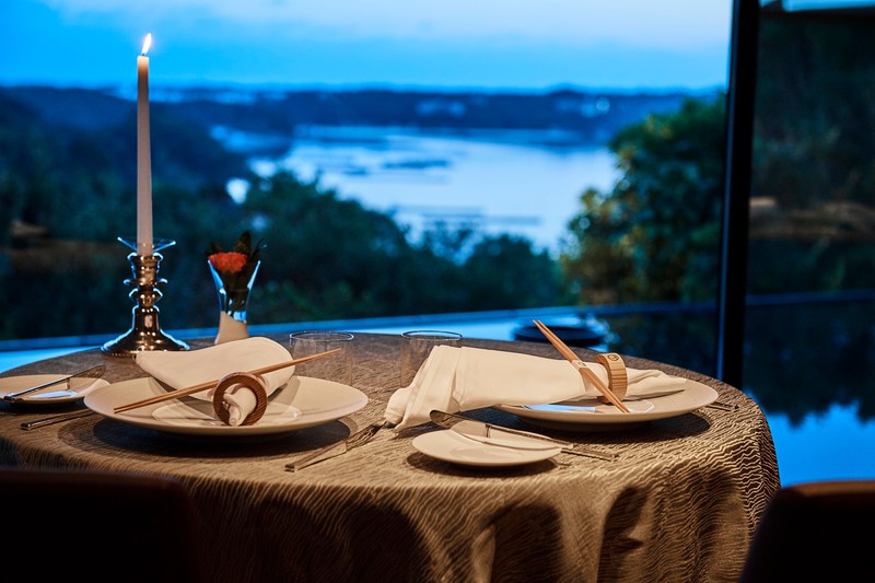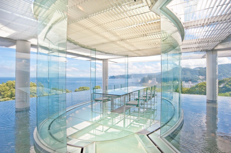▲ ダイニングのウォーターバルコニー。すべてガラス(テーブルやイスも)で、視界の中に人工物が主張されないため、周囲の自然に溶け込んだ気分。