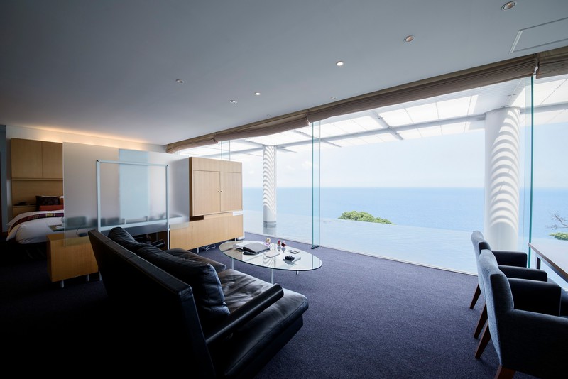 客室はすべてオーシャンビュー。相模湾に浮かぶ目の前の初島や伊豆大島、晴れた日は房総半島まで望めます。彼女との特別な日ならば、ハイエンドな「誠波」をチョイスしたいところ。リビングやベッドルーム、バスルームが横に並んだ造りで、海側の壁はすべてフルハイトのガラス窓。いつでも、部屋のどこからでも、ふたり並んで海を眺められる、なんて贅沢!
