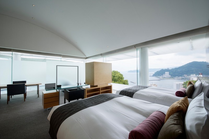 客室は本館、SPA&SUITE棟、プレミアム棟の3つに分かれ、全76室。SPA&SUITE棟は全室のテラスに露天風呂をしつらえ、その先にはさえぎるもののない眺望が広がります。プレミアム棟のうち、13室も露天風呂付き。最高級の「温泉露天付きテラスルームP4」には温泉に加えて、温水プールもあります。