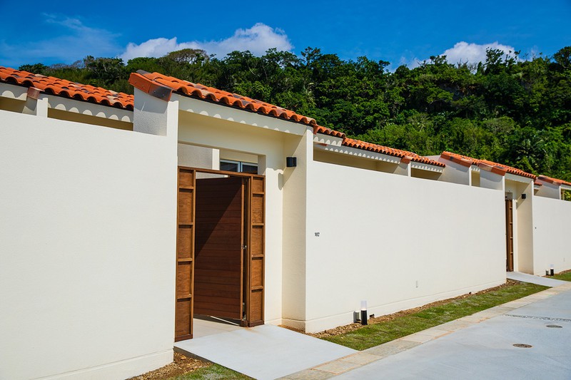 ヴィラのエントランス。山田城(やまだグスク)の森を借景に、赤瓦が映える。