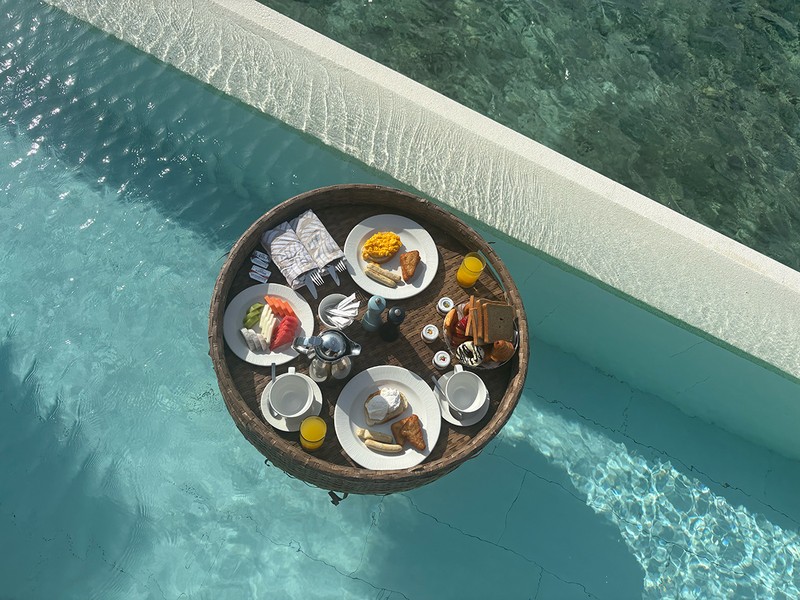 写真のように、ホテル付近にある「バア環礁」は世界で最もマンタが多くみられる場所であり、マンタ特有の摂食行動である「サイクロン」を観察できる世界でも数少ない場所の1つだそう。シュノーケリングで水族館に泳いでいるような巨大なマンタとグループデートをしたり、SUPで一寸法師のように海を駆け抜けることだって朝飯前からできちゃいます。