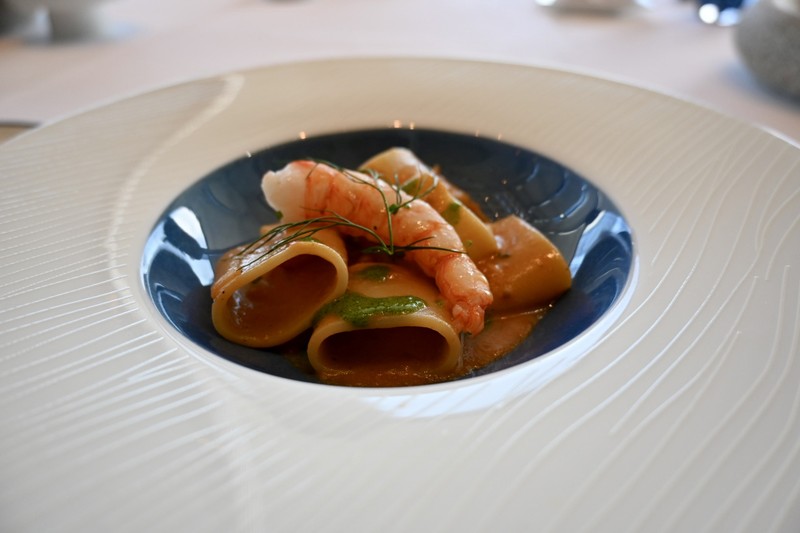 なかでも、シェフのシグニチャーディッシュのひとつであるシチリア産の赤エビが主役のパスタはエビのプリッと具合がもう最高! 濃厚な魚介ベースのソースもスープのごとく、一滴残らずいただきました。