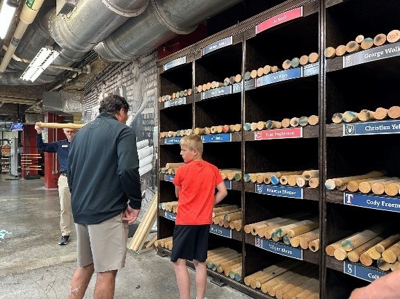 ▲ 少年が真剣にバッドを選んでいるのが印象的でした。鈴木誠也のユニフォームを来た少年もいましたよ! 入場料には、原木からバットに形成されるまでの製造工程を見ることができるガイド付きのツアーが含まれています。ツアーやショップでは野球少年たちが目を輝かせていました。