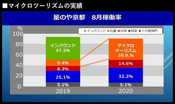 「星のや東京」においても、昨年8月のマイクロツーリズムは9.2%にすぎなかったが、今年は53.0%と大幅な伸びを見せた。だが、東京は圧倒的なインバウンド市場であり、同施設のインバウンドは昨年ベースで77.2%にも上っていた。マイクロツーリズムだけではインバウンド消失分をカバーするには至らず、稼働率で見ると60%弱にとどまった。