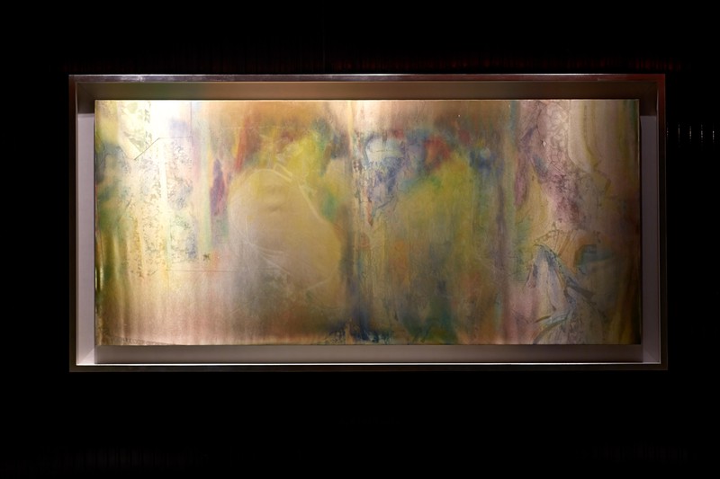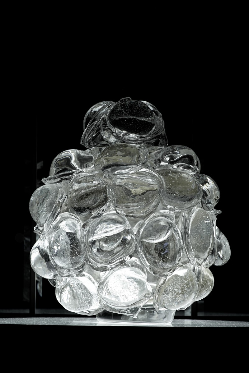 琵琶のまわりにガラス玉が飾られた名和晃平さんの作品は、エントランスを入るとすぐ目に留まります。
