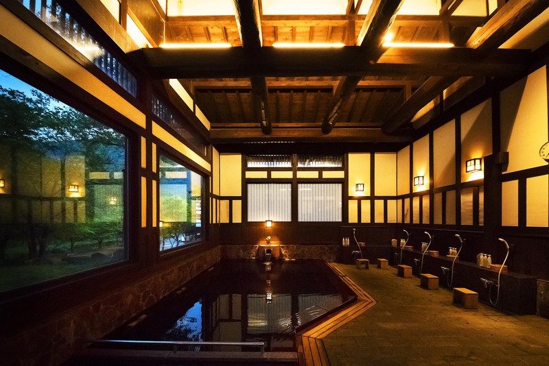木のぬくもりが感じられる昔ながらの構造の内湯。ぬるめの湯なので、じっくりと温っていると、湯の泡が肌を包み、日々の疲れを癒してくれる。