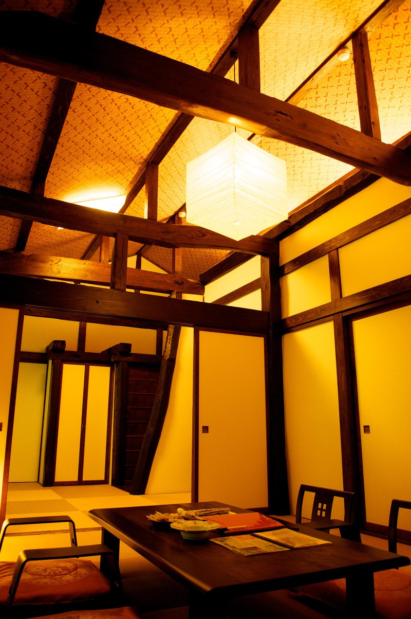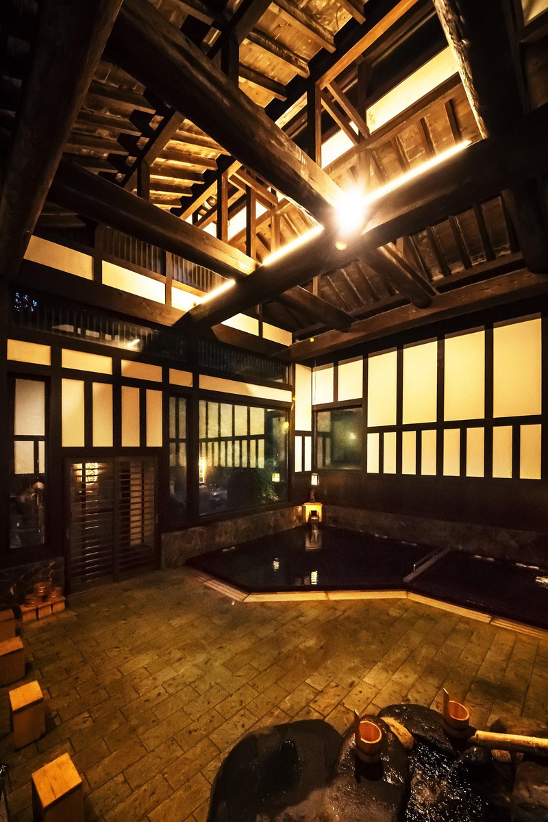 こちらは、湯温を41度前後に加温した内湯の中のあつ湯。高い天井に見える大きな梁に圧倒される。