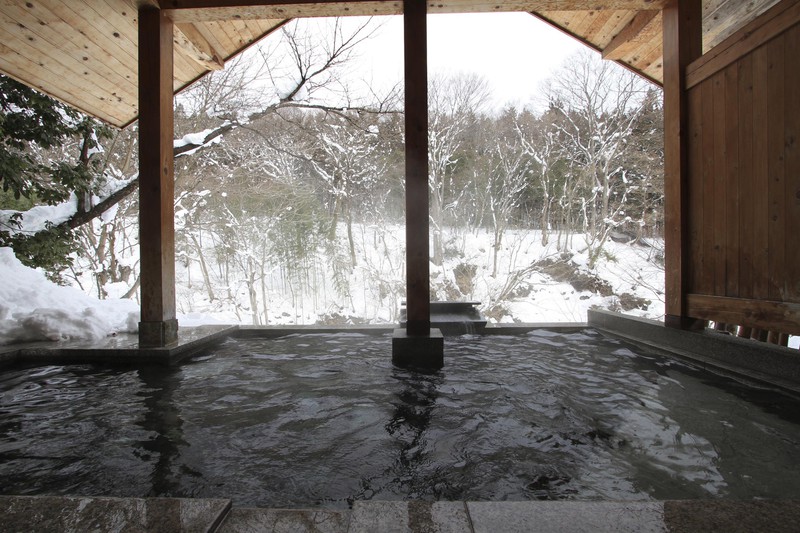 大浴場は露天風呂と内風呂がふたつずつの計4つ。写真は、谷川渓谷を望む露天風呂「ほたるの湯」。