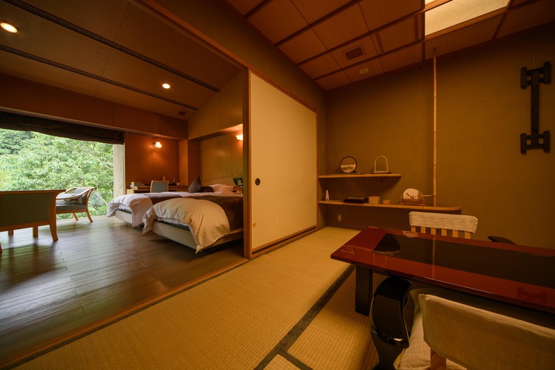 客室「和洋室301舞雪」は、ツインベッドルームに8畳の和室、専用露天風呂のついた部屋。大きな窓と露天風呂から美しい自然が楽しめる。