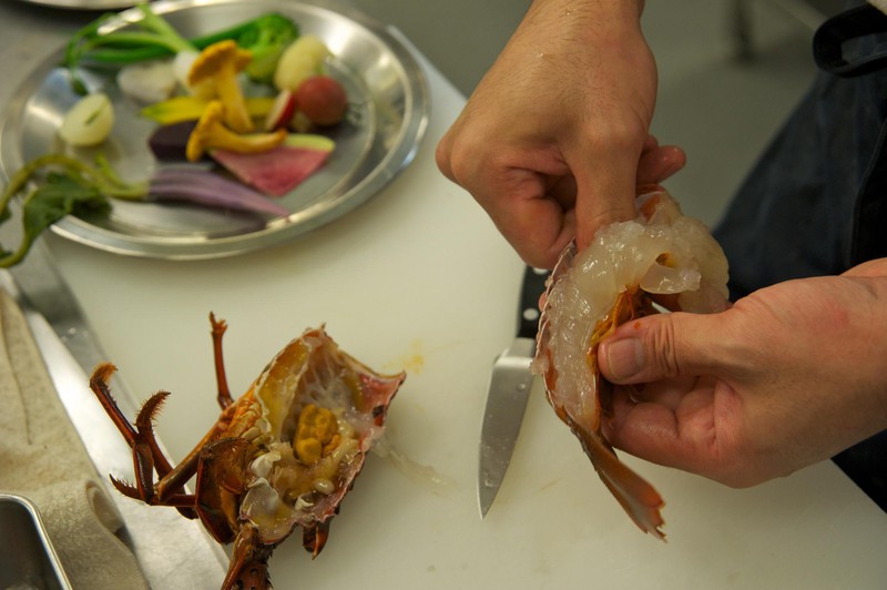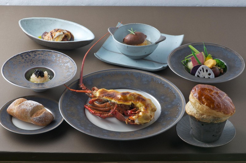 ぷりぷりの伊勢海老は、フレンチのテルミドールに変身。色とりどりの野菜はサラダに。