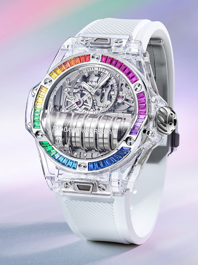 『ビッグ・バン MP-11 14デイ パワーリザーブ サファイア レインボー』 手巻き、サファイアクリスタルケース(45㎜、バゲットカットカラーストーン50個)、ホワイトラバーストラップ。3気圧防水。世界限定50本。1494万9000円/ウブロ