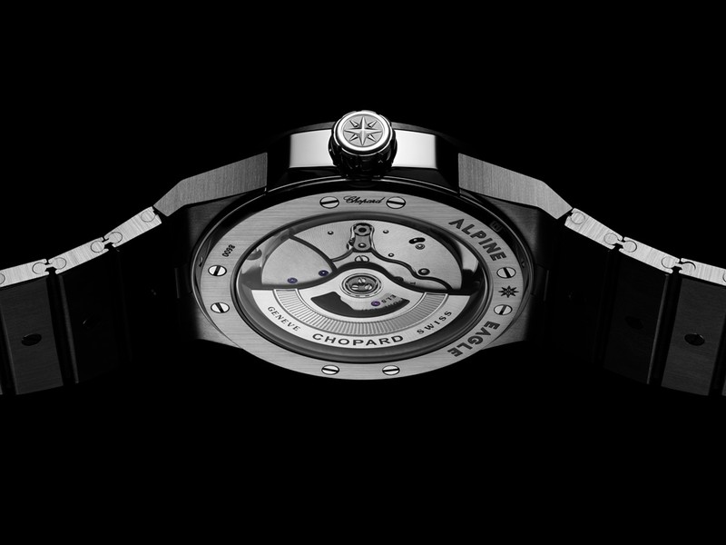 ▲ 搭載ムーブメントは、すべてC.O.S.C認定クロノメーター。ショパールの基幹ムーブメントの開発・製造を担当するフルリエ エボーシュ製で、自動巻きのローターを片方巻き上げ式にして、動きの少ないデスクワークでも効率よくゼンマイが巻き上がります。その美しい仕上げは、ケースバックから眺め愉しむことができます。