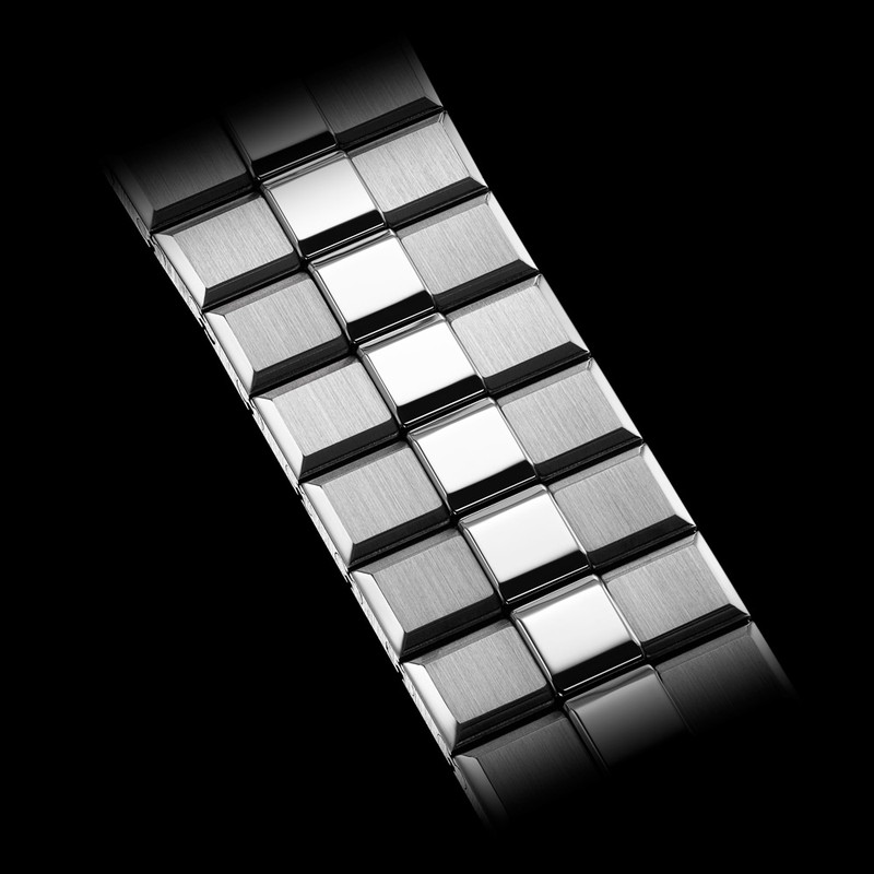 それは、サージカルスティールに匹敵する低刺激性・低アレルギー性を備えること。一般的なステンレススティールの1.5倍の摩耗耐性と、優れた硬度をもつこと。そして、均質な結晶構造と純度の高さにより、ゴールドと同等の輝きと光度を実現したこと。