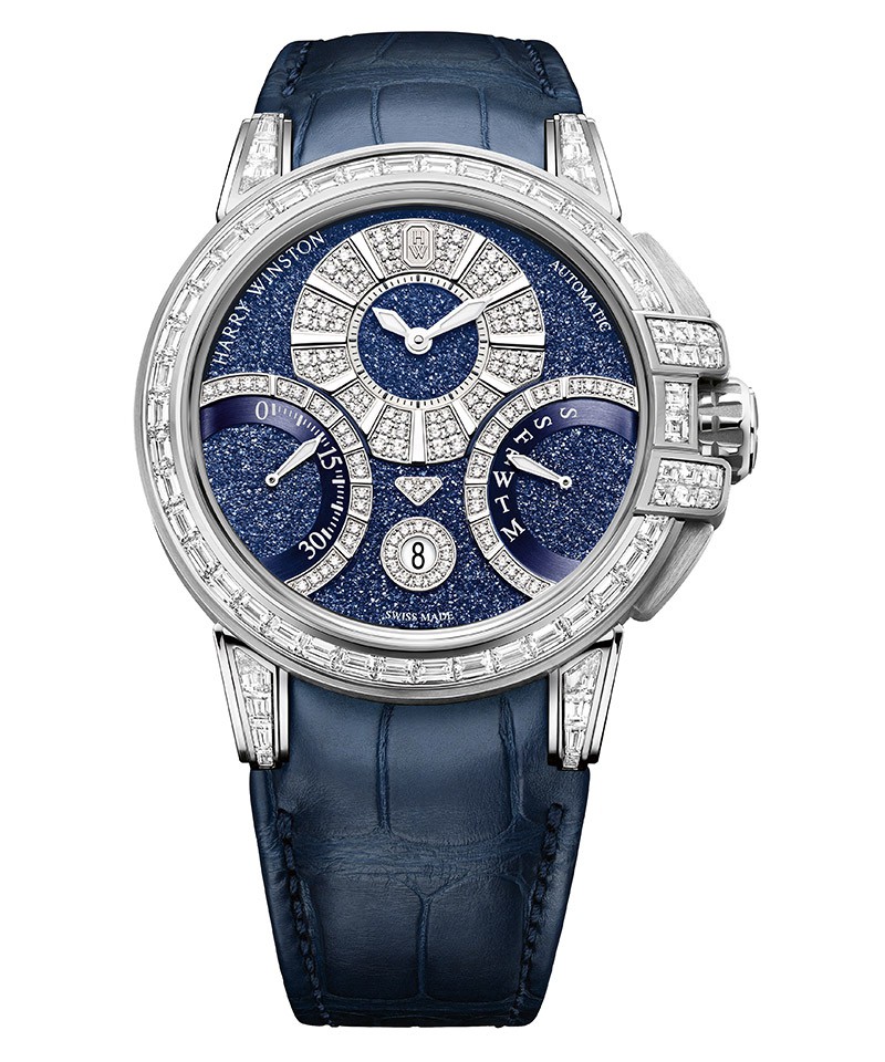 「HW オーシャン・スパークリング バイレトログラード オートマティック 42mm」自動巻き、18KWG×ダイヤモンドケース(42.2㎜)、アリゲーターストラップ、世界限定20本。1425万円/ハリー・ウィンストン(ハリー・ウィンストン クライアントインフォメーション)