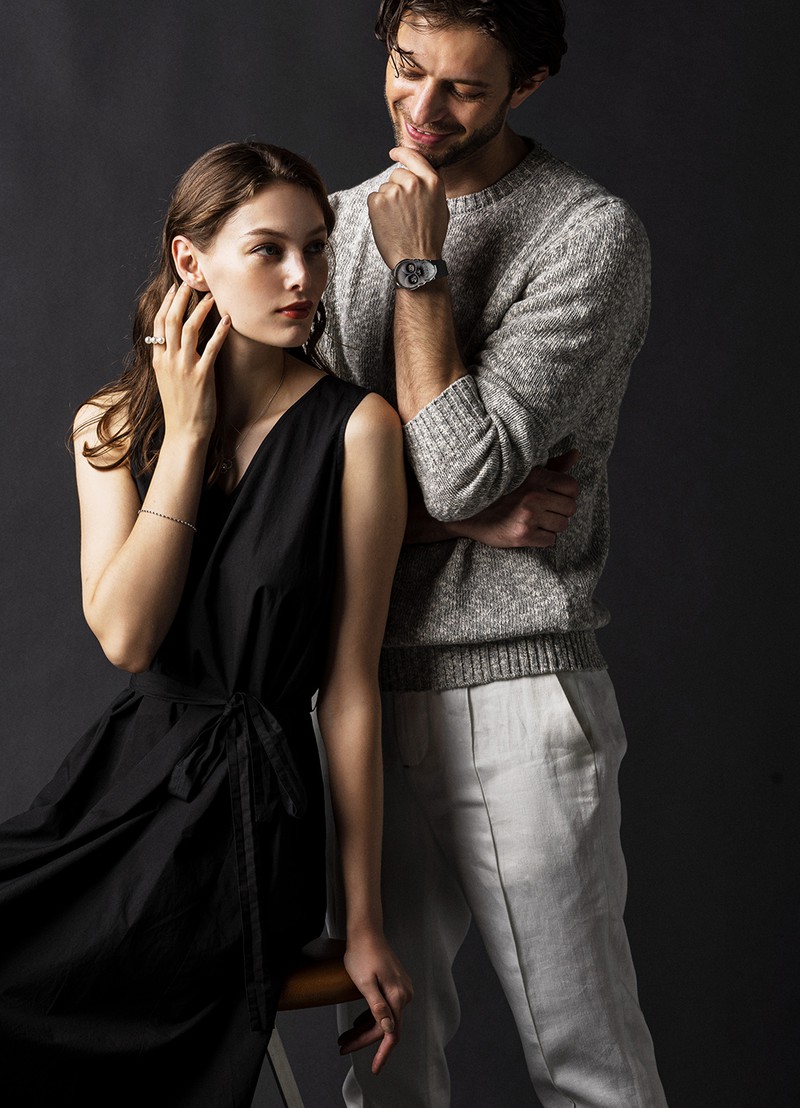 ▲ 男性●時計352万円/タサキ、ニット13万2000円、パンツ11万9900円/ともにイザイア(イザイア ナポリ 東京ミッドタウン)  女性●ワンピース3万4100円/バグッタ(トレメッツォ)、リング37万4000円、ブレスレット56万3200円/ともにタサキ