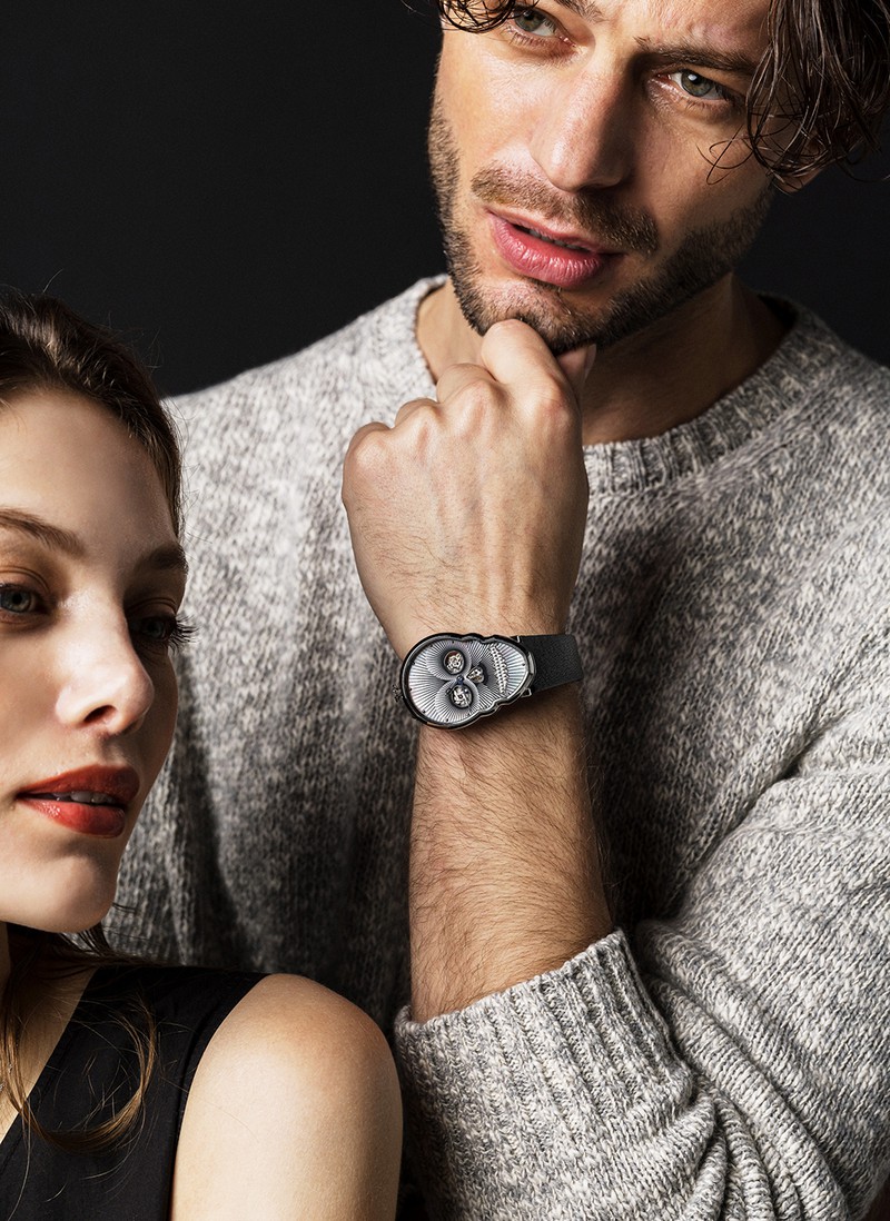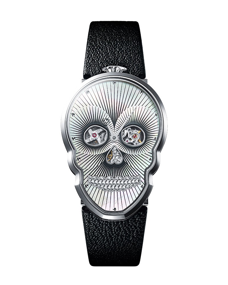 そこで、マザーオブパール(真珠母貝)をあしらったエッジな腕時計はいかがでしょう。ケースも文字盤もスカルをリアルにかたどっており、アートなインパクト漲る仕上がり。誰もが二度見すること確実の、飛び道具ならぬ飛び時計です。