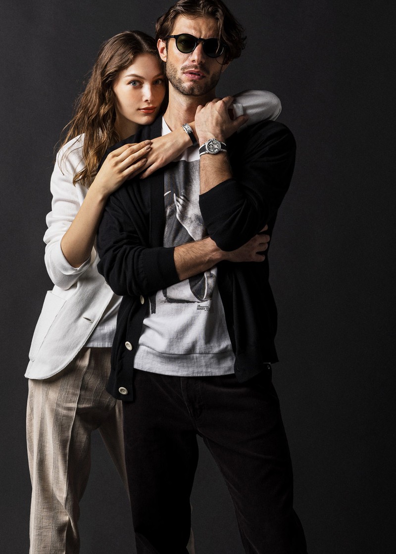 ▲ 男性●時計785万4000円/ハリー・ウィンストン(ハリー・ウィンストン クライアントインフォメーション)、カーディガン3万7400円/キャバン(キャバン 代官山店)、Tシャツ1万7600円/ザ インターナショナル イメージズ コレクション(ノウン)、パンツ6万3800円/ビズビム(F.I.L TOKYO)、サングラス3万9600円/モスコット(モスコット トウキョウ) 女性●時計248万6000円/ハリー・ウィンストン(ハリー・ウィンストン クライアントインフォメーション)、ジャケット7万5900円/ラルディーニ、トップス2万5300円/チルコロ 1901、パンツ2万9700円/ブリリア1949(すべてトヨダトレーディング プレスルーム)