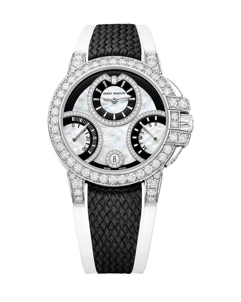 ▲ 「HW オーシャン・バイレトログラード ブラック&ホワイト オートマティック 36mm」自動巻き、18KWGケース(36mm)、ラバーストラップ。10気圧防水。世界限定100本。785万4000円。/ハリー・ウィンストン(ハリー・ウィンストン クライアントインフォメーション)
