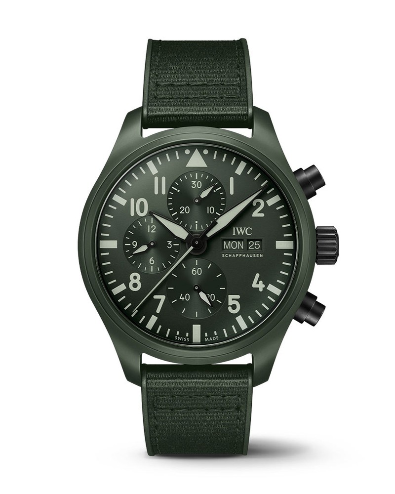 ▲ 「パイロット・ウォッチ・クロノグラフ・トップガン“ウッド・ランド”」自動巻き、グリーンセラミックケース(44.5mm)、ラバーストラップ。6気圧防水。年間1000本限定生産。IWCブティックおよびEブティクのみの販売。139万1500円/IWC