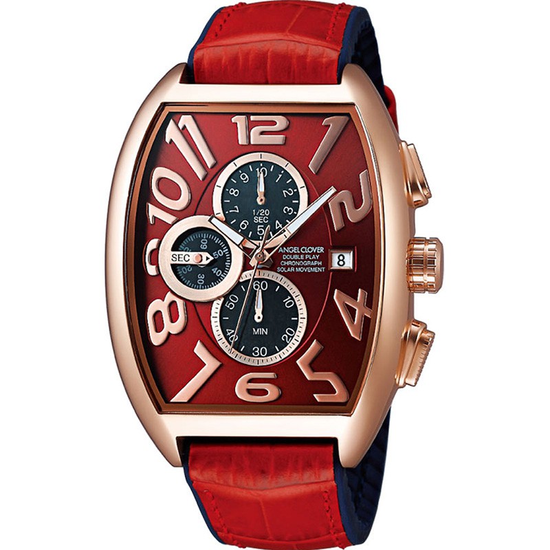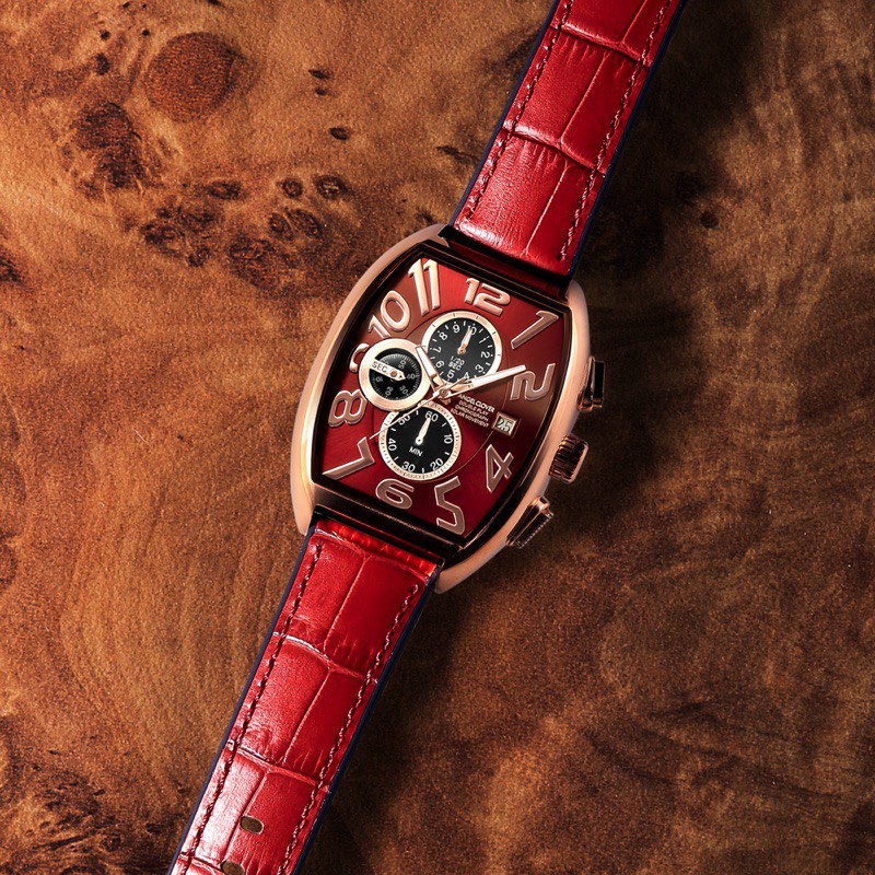 腕元を最大限に主張するならこちらのトノー型の赤×金がオススメ。「DPS38PRE-RE」ソーラークォーツ、SSケース(ケースサイズ W38×H44mm)、カーフレザー&ラバーベルト、3気圧防水。2万6000円(税抜き)/ウエニ貿易