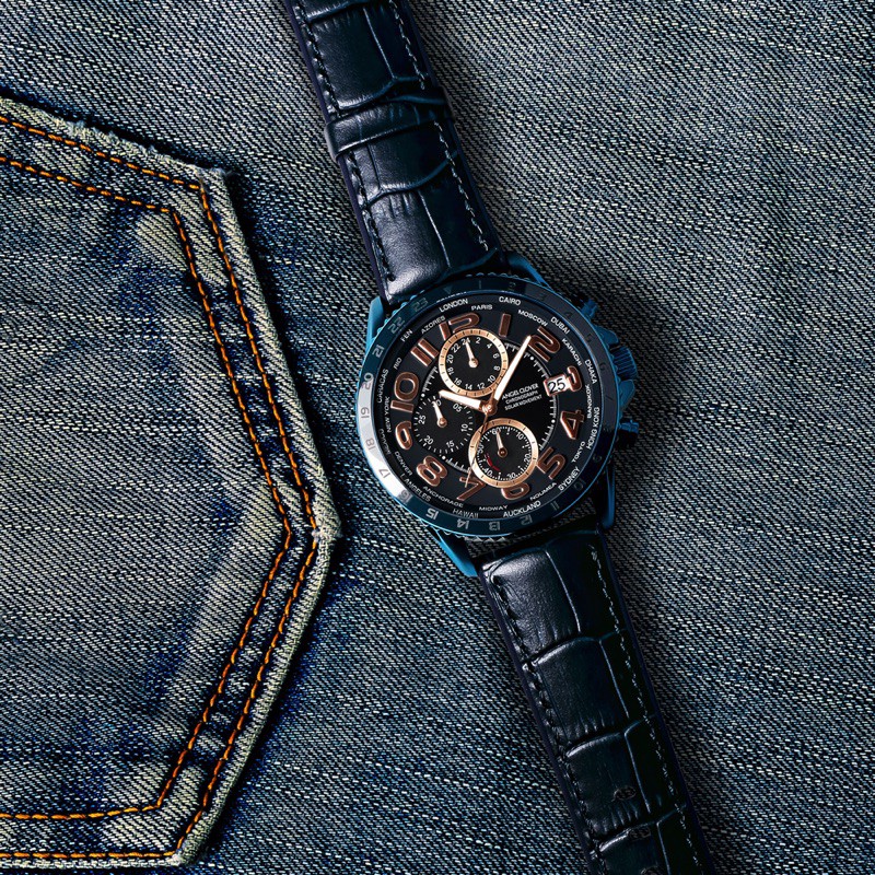 クロノグラフのダイアル内には、プッシャーを長押しするだけで充電の残量を確認できるパワーリザーブインジケーターも搭載。カーフレザーの側面と裏面にラバーを配したベルトは耐久性も抜群で、世界中どこにでもこれ一本で出かけられちゃいます。