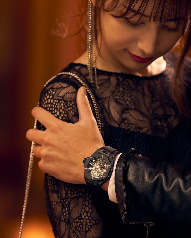 ▲ 男性●時計1281万5000円/ウブロ、レザーブルゾン20万9000円/ルッフォ(バインド ピーアール)、カットソー3万9600円/ジョン スメドレー(リーミルズ エージェンシー)、女性●ワンピース5万9400円/マサコ テラニシ(アプレドゥマン)、イヤーカフ6万3800円、ブレス5万600円、リング4万2900円、バッグ11万8800円、/すべてジミー チュウ(ジミー チュウ)