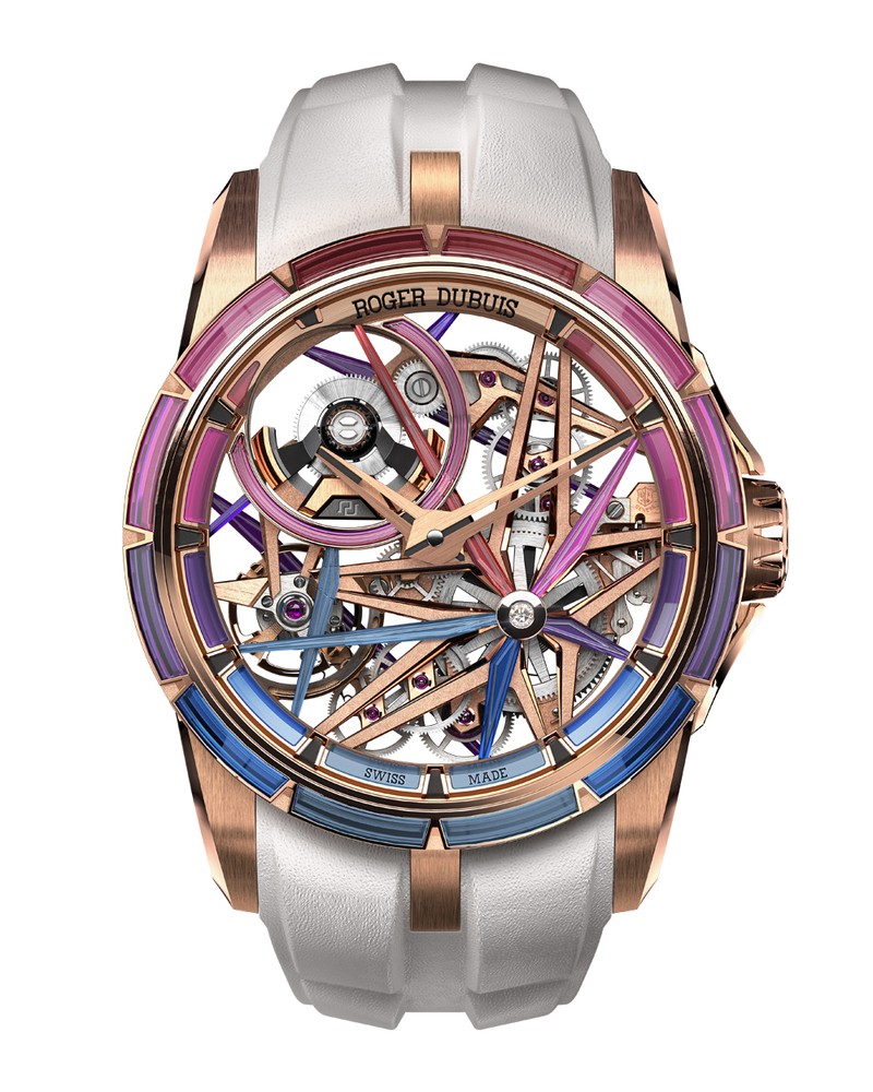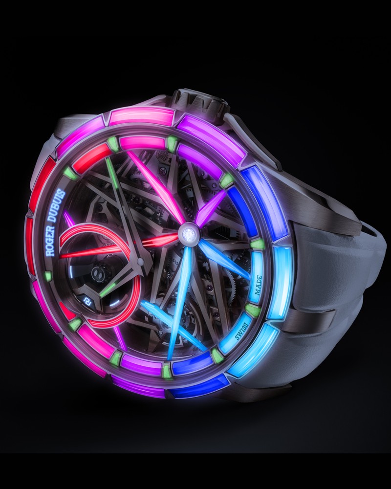 しかもこのスピネルはスーパールミノバでコーティングされ、暗闇では腕元がまるで夜のパレードのようにカラフルに煌めく! ロジェ・デュブィの革新的なウォッチメイキングの象徴のような一本です。