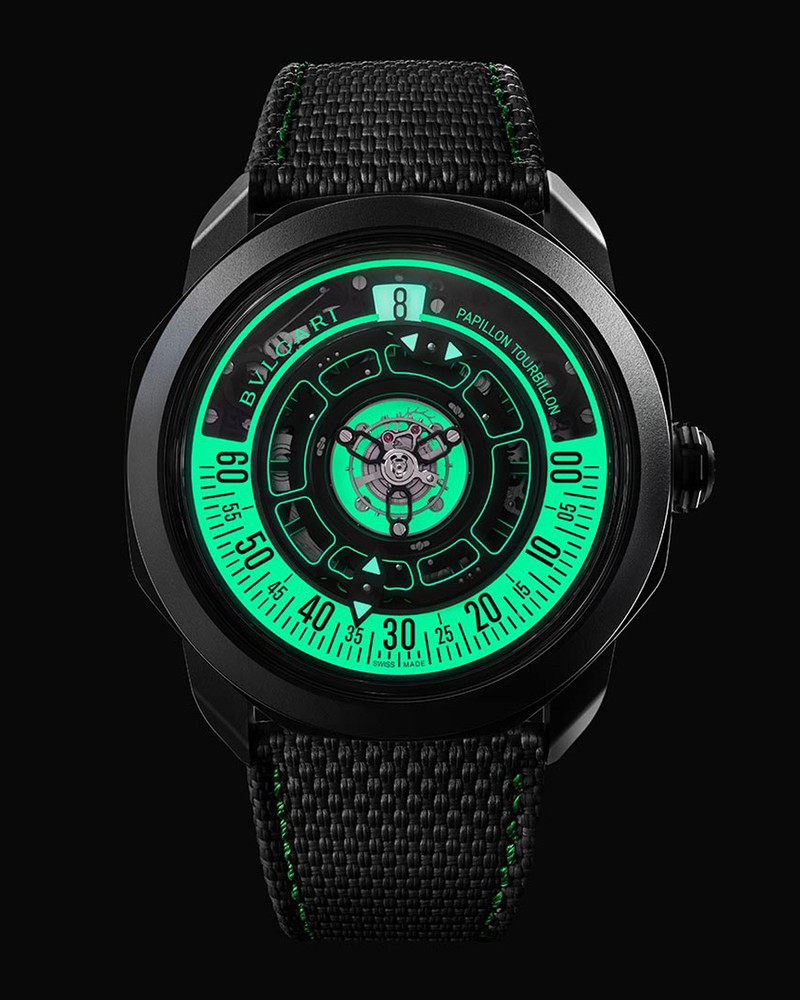 夜間の視認性を確保するため針やインデックスを蓄光塗料などで光らせる時計は珍しくありません。ですが、蓄光を実用方面ばかりではなく、周囲にちょっとしたサプライズを与えるため、あるいは時計の美しいデザインを際立たせるために使用する時計も世の中にはあります。