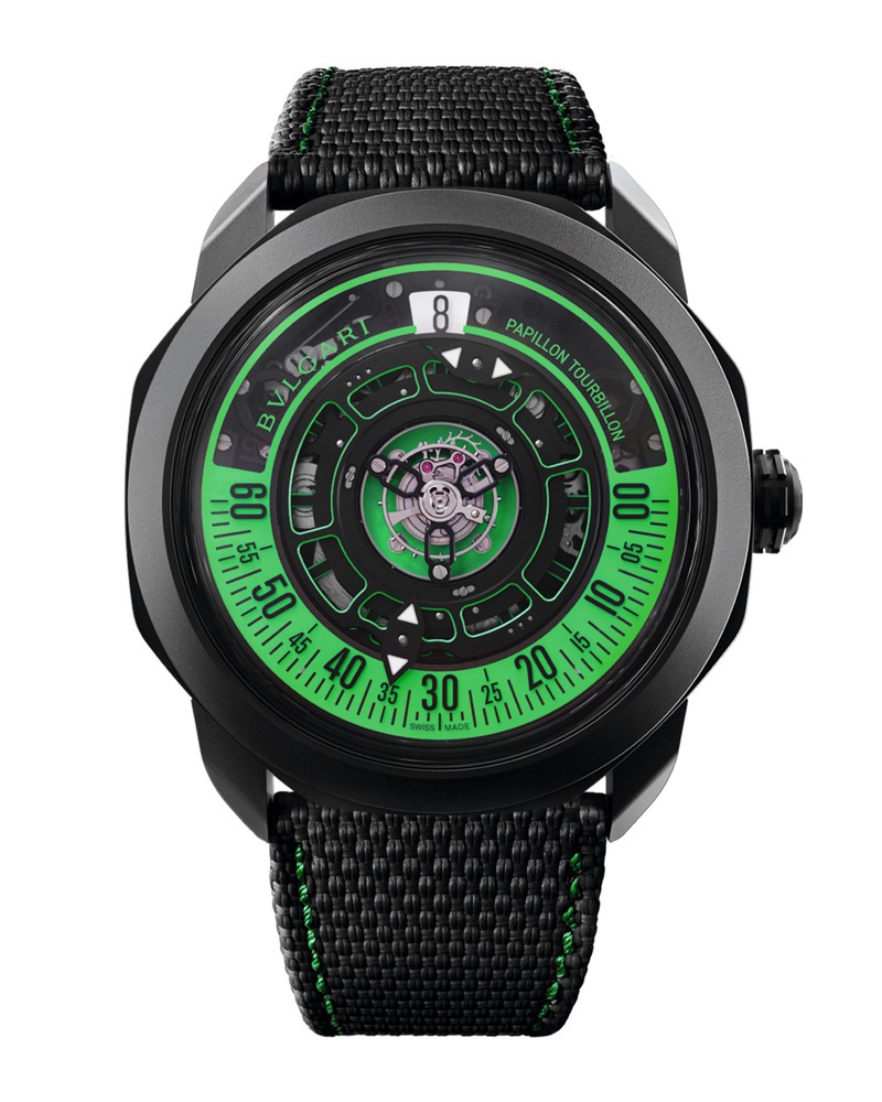 分を示す針は対角線上に2本あり、60分が経過するごとの入れ替わりの様もとてもユニークです。マットなブラックチタンケースの随所にグリーンの夜光塗料を施したことで、独特のフューチャリステイックな雰囲気を醸しており、一歩先行くセンスを見せつけたい方に最適なモデルです。