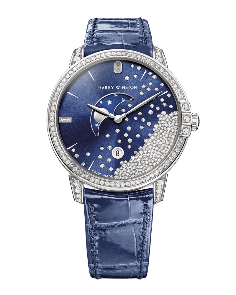 文字盤中央部には三日月型の窓から、スパンコールのエナメル上にポリッシュ仕上げの月と星が浮かび上がり、独特の詩情を一層高めています。ちなみに、ダイヤルとケース全体で使用するダイヤモンドは305個(約1.51カラット)!
