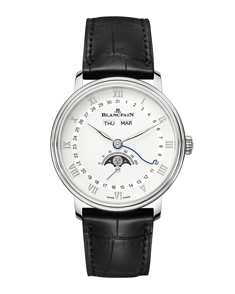 とりわけクラシックなデザインと組み合わせたヴィルレ コンプリートカレンダーは2010年に誕生し、高い人気を誇ります。優雅な丸みを持つダブルステップベゼルやほっそりしたインデックス、セージの針を切り取った時分針などがメゾンらしい格調を感じさせるなか、ムーンディスクのどこかユーモラスな表情の月が可愛らしいアクセントになっています。こんなモデルが腕にあれば、女性との会話も弾むこと請け合いです。
