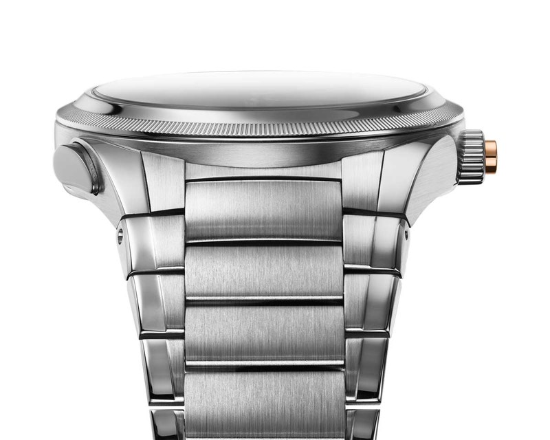 また、GMT機能自体も驚くほど研ぎ澄まされています。8時位置のボタンを押すと、通常は重なっている2本の時針のうち、上側のローカルタイム用の針が1時間ずつ進み、下側のローズゴールドの針がホームタイムとして残る仕組み。ね、簡単ですよね?