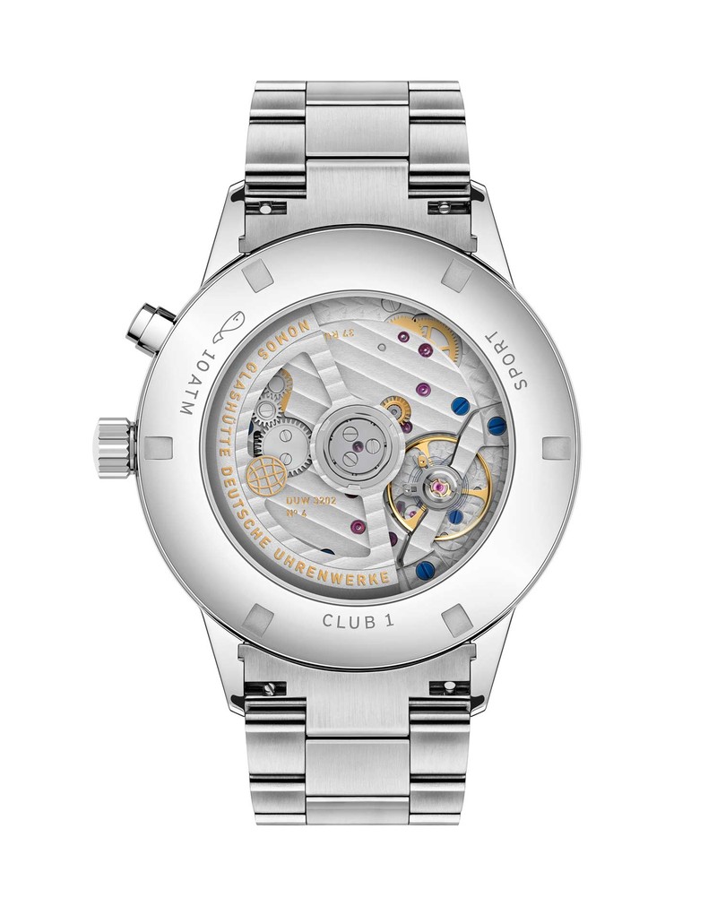 また、搭載する自社製キャリバーDUW 3202は厚さわずか4.8mmの薄型自動巻きで、輪列内部に複雑機構を組み込む革新的な設計。裏から覗く仕上げも見事で、理路整然としたドイツ的な美しさに思わず見惚れます。