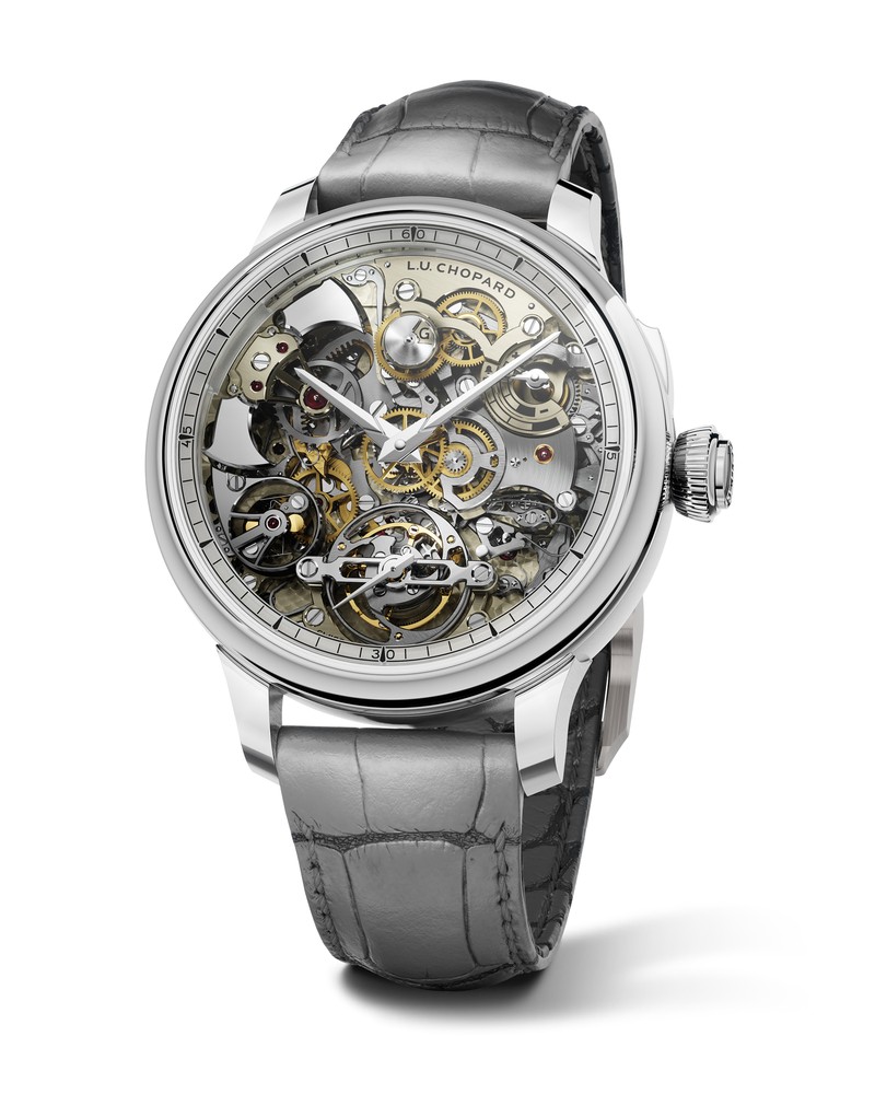 ▲ 「L.U.C グランド ストライク」手巻き、18Kエシカルホワイトゴールドケース(43mm)、アリゲーターストラップ。1億2862万3000円(税込予価)/ショパール