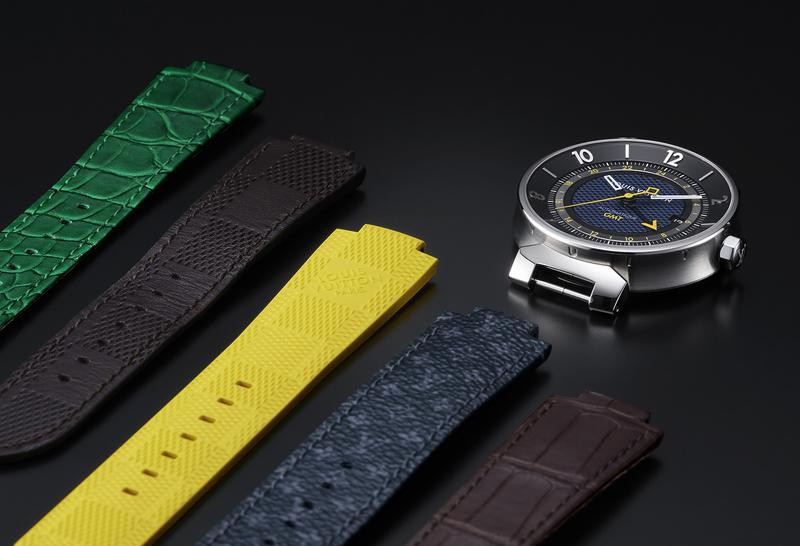 ▲手前から、アリゲーターストラップ6万9000円、モノグラム・エクリプス キャンバス ストラップ4万7000円、ラバー ストラップ4万7000円、カーフレザー ストラップ5万4000円、アリゲーター ストラップ6万9000円、「タンブール ムーン GMT ブラック」自動巻き、SSケース。63万7000~円(付属させるストラップにより価格は変動します)/すべてルイ・ヴィトン(ルイ・ヴィトン クライアントサービス)