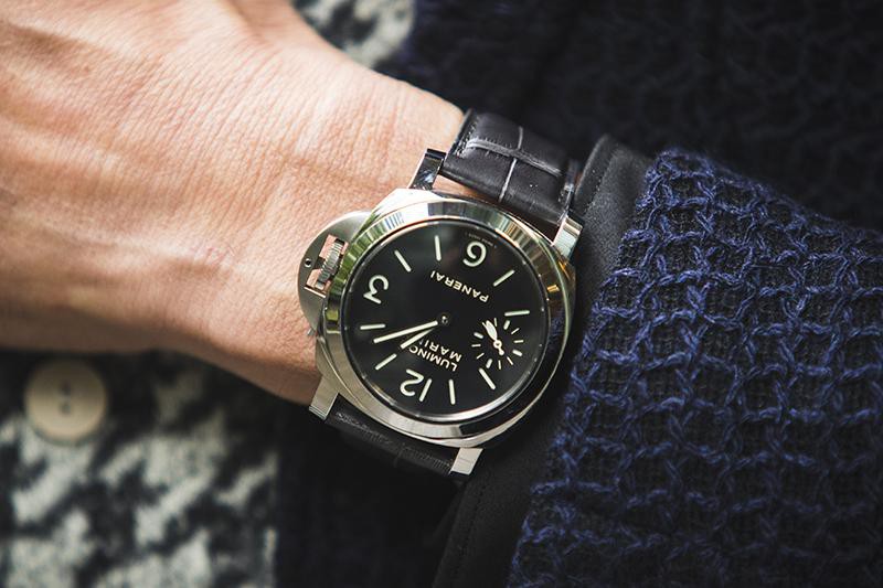 パネライの大定番「ルミノール マリーナ」。デカ厚時計の名作が、黒の革ベルトを装着したことで一層ダンディに。