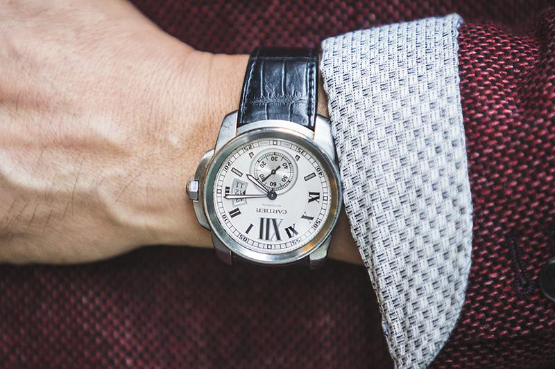 こちらはカルティエの「カリブル ドゥ カルティエ」。グロッシーなクロコダイルベルトが艶やかなフェイスデザインと響き合っています。