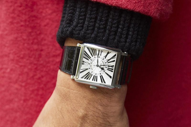 フランク・ミュラーの「マスタースクエア」。やや大きめのサイズですが、薄めに仕立てたクロコダイルベルトにより、手首に心地よくフィット。