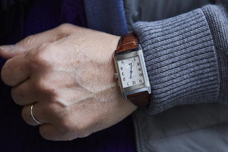 角形時計の大傑作、ご存知ジャガー・ルクルトの「レベルソ」。この時計にはやっぱり革ベルトが似合います。