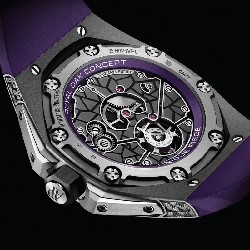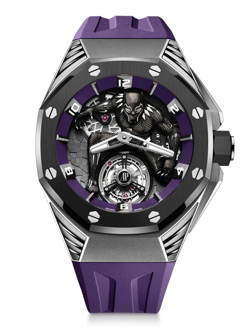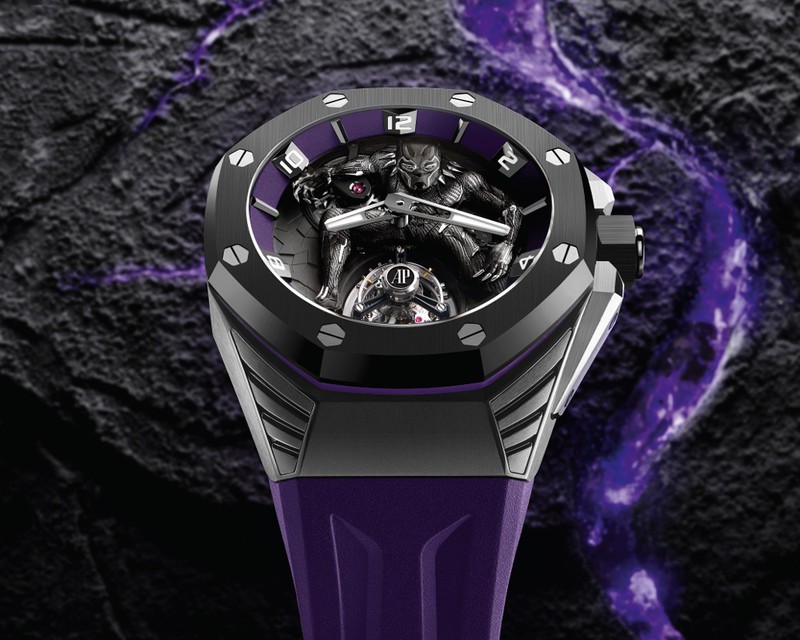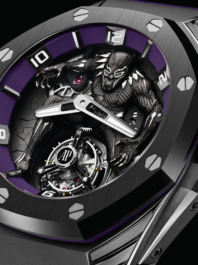 しかも、出来上がった時計ロイヤル オ-ク コンセプト “ブラックパンサー”フライングトゥールビヨンは、デザインや機構、そして芸術的技法の全てが超一流であるだけでなく、映画『ブラックパンサー』の物語や世界観もしっかりと取り入れています。こういった時計作りは、コラボだからこそ可能なもの。そんな両者の深い結びつきを感じてください。