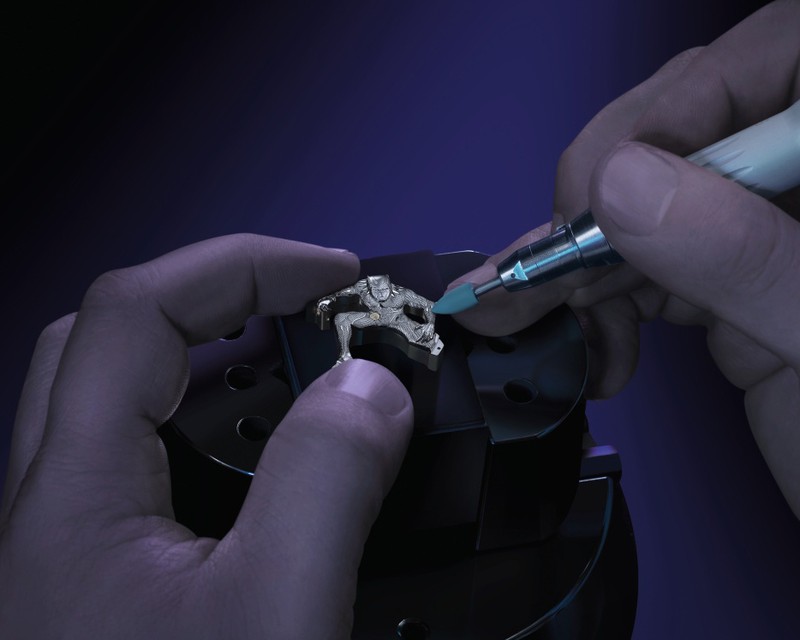 これは職人による彫金技法で1つ1つ作られており、スーツの素材感や筋肉の質感などもリアルに表現されています。さらにその上からペインティングを施すことで、ヒーローの姿をよりリアルに描き出していますが、この部分だけでも4名のエングレーバーと4名のペインターが30時間かけて作業するそう。しかし、この精密さと迫力を考えれば納得できるでしょう。