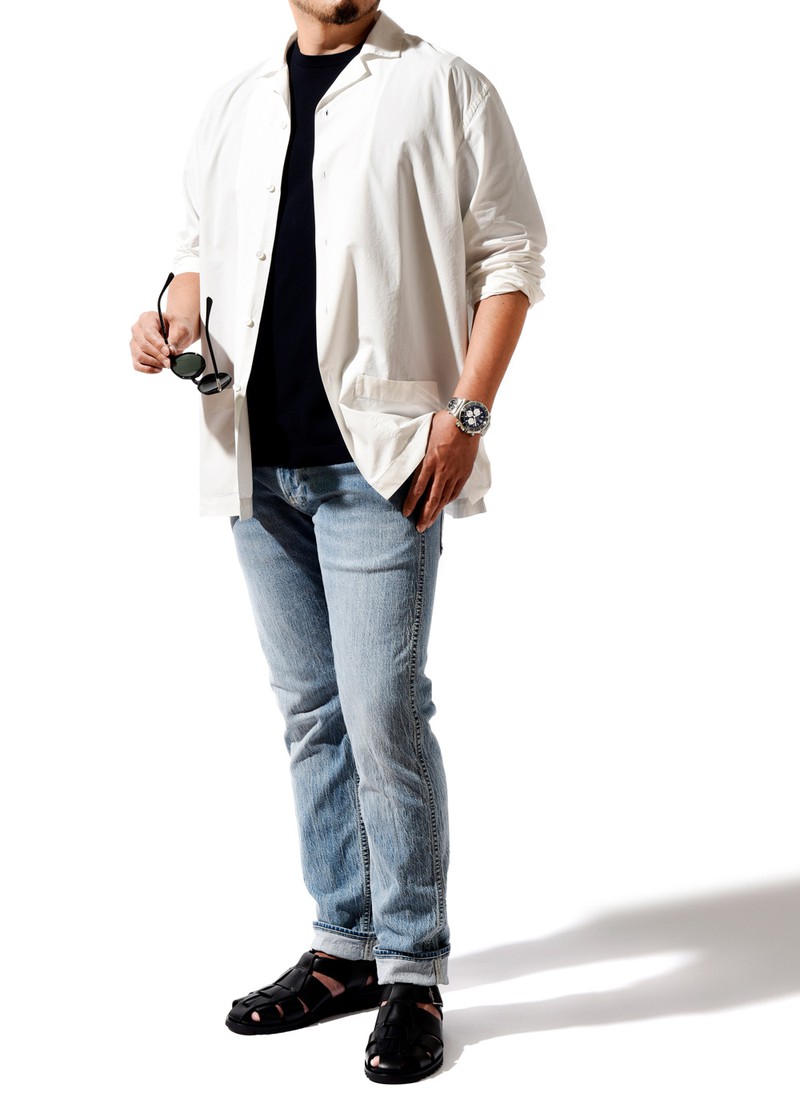 ちなみに、ここではいているデニムは、リーバイス®501®のヴィンテージ。時計と同じく、ストーリーのあるアイテムを合わせることで、男前度をさらに後押し。男臭くなりすぎないよう白のシャツジャケで清潔感をプラスしているのも手練れのテクです。
