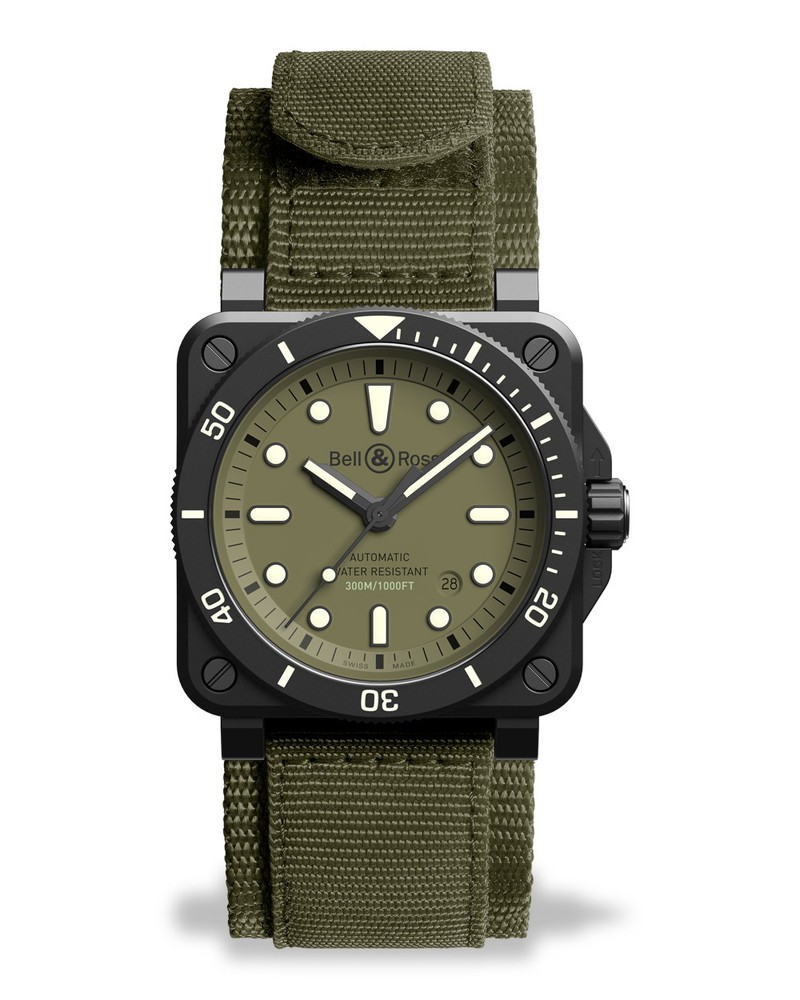 ▲ 「BR 03-92 ダイバー ミリタリー」自動巻き、セラミックケース(42mm)、ファブリックストラップ(ラバーストラップが付属)。300m防水。世界限定999本。56万1000円/ベル&ロス(ベル&ロス ジャパン)